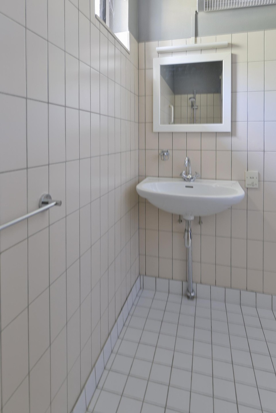 De 2e badkamer is voorzien van een douche-hoek, wastafel, raampje en lichte betegeling.