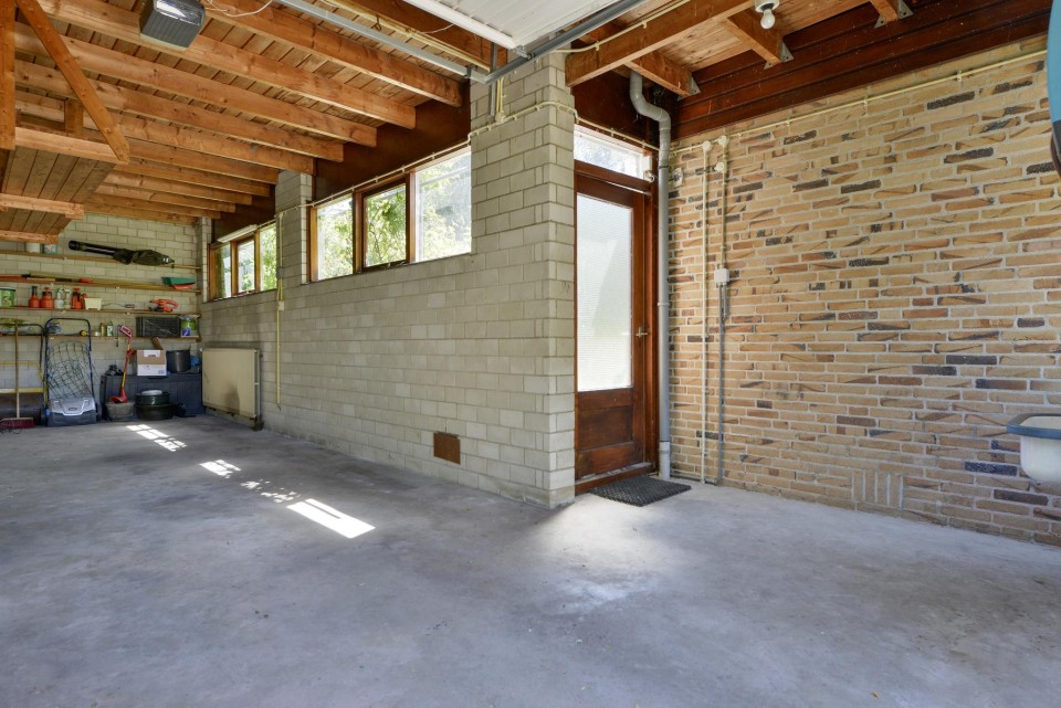 Een zijdeur in de garage geeft toegang naar de achtertuin met zonneterras.