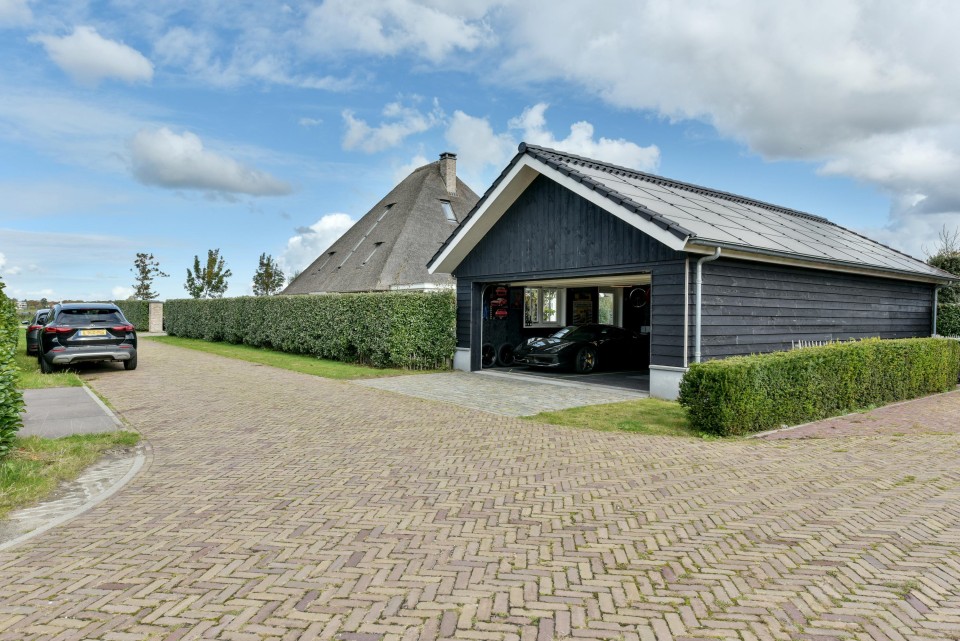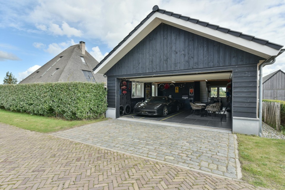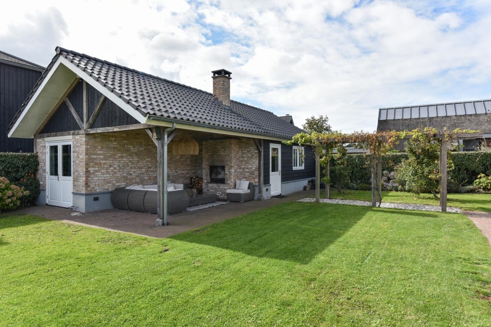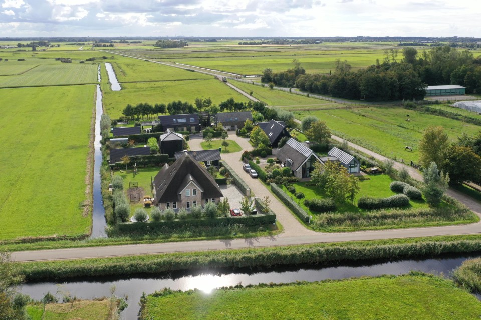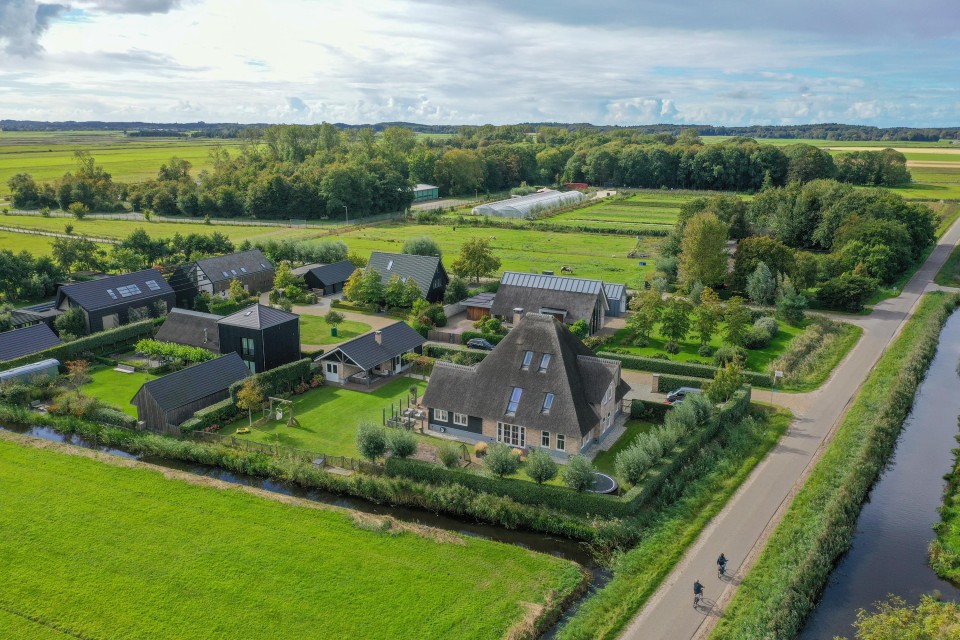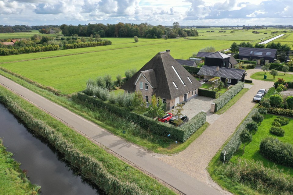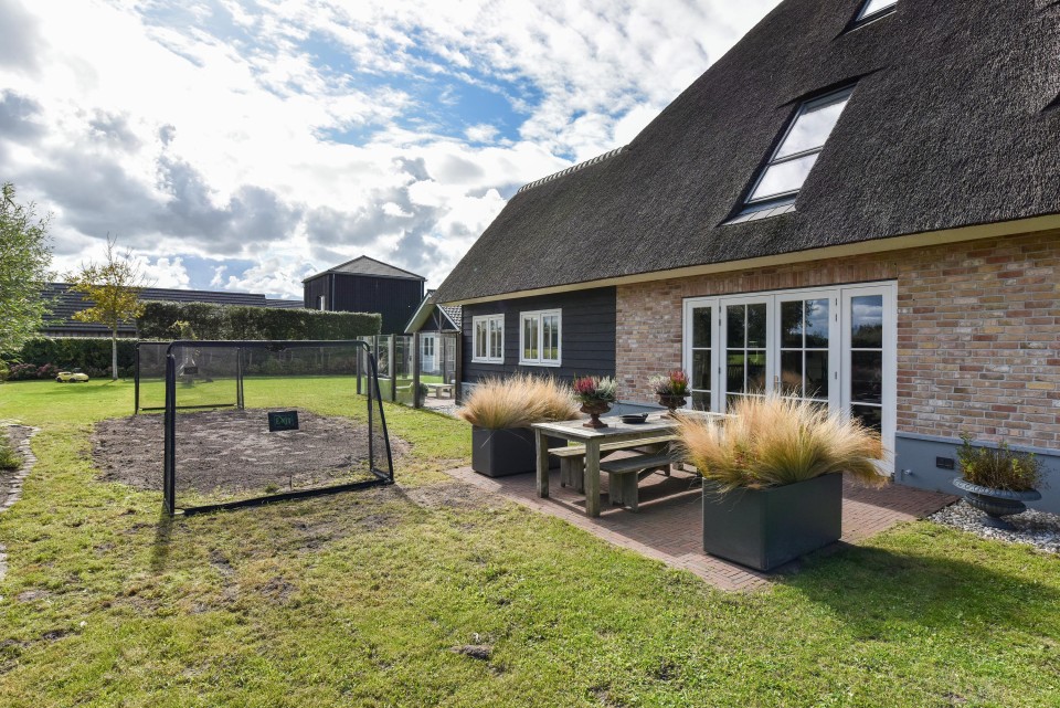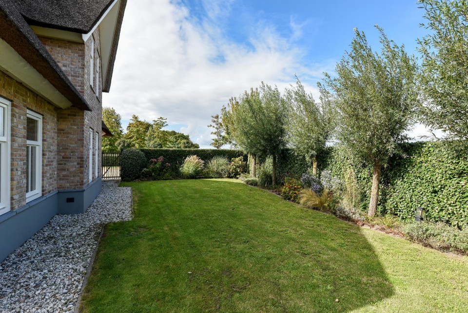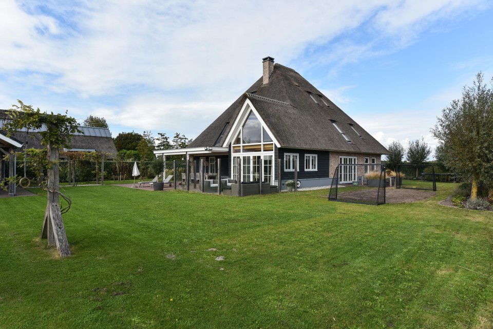 Uniek en modern landhuis met fraai riet-gedekt dak, vijf slaapkamers, twee badkamers, een grote tuin met volop privacy en een groot functioneel bijgebouw/garage.