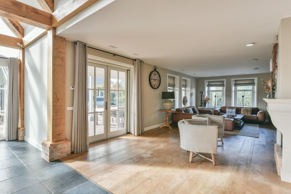 Aangrenzend is de royale zitkamer met een openhaard, brede eiken delenvloer en openslaande deuren naar het grote overdekte terras op het zuidwesten.