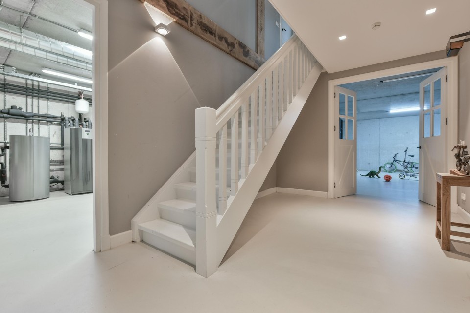 Ruime entree-hal met toilet. Trap naar het grote souterrain met een stahoogte van 2.62m voorzien van vloerverwarming. Het souterrain bestaat uit een grote hobbyruimte en een separate werkplek. Tevens is hier de technische ruimte voor de warmte grondpomp, de WTW-installatie, een warmwater voorraadvat van 400 liter en een waterontharder.