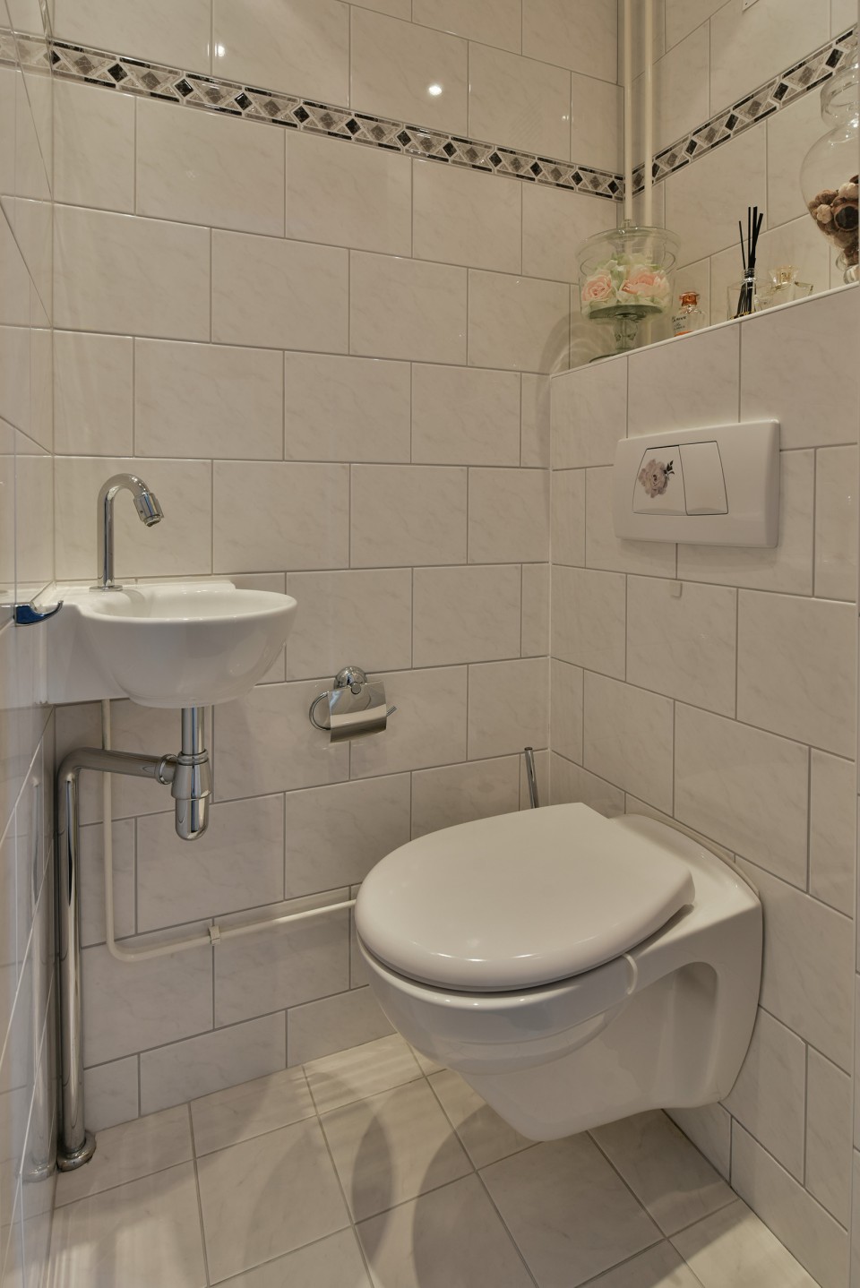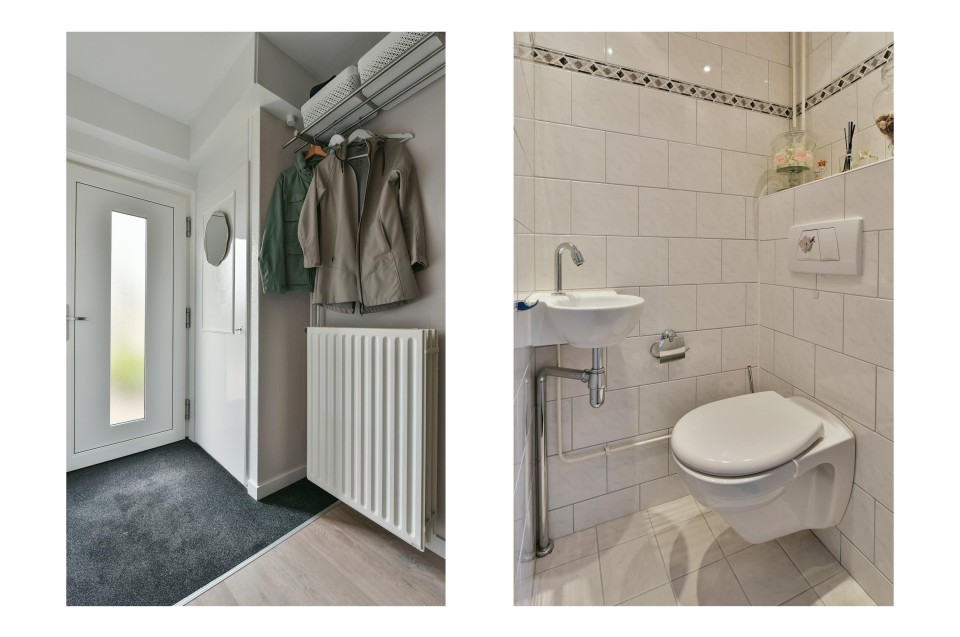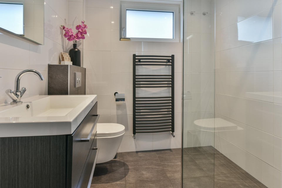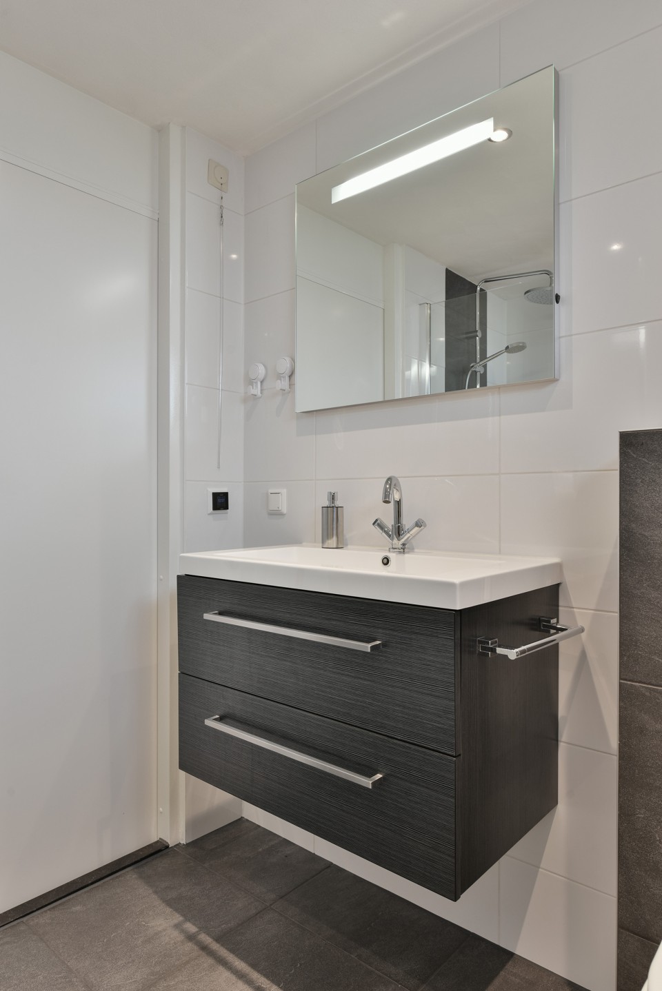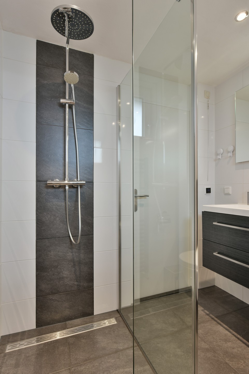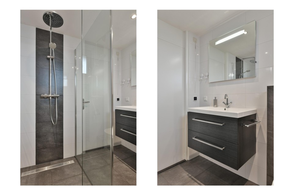 De badkamer is vernieuwd in 2015 en is voorzien van een inloop-douche, 2e toilet en een wastafelmeubel. Grote lichte wandbetegeling en een raampje, kunststof kiep-kantelraam HR++ met bijpassend hor.