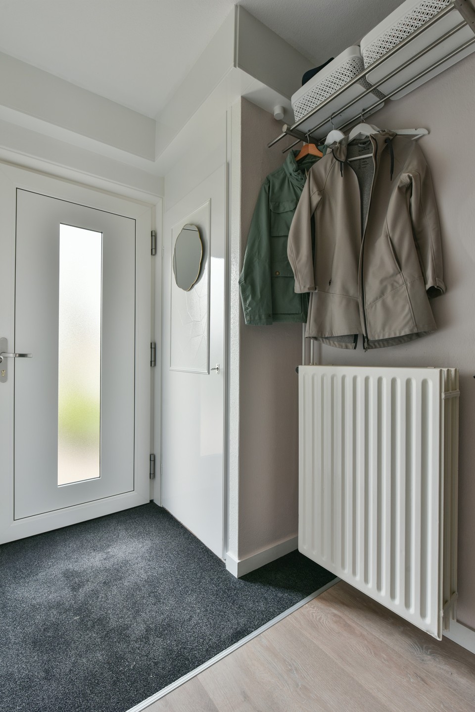 Entree-hal met meterkast voorzien van automaten, en toilet met fontein, de royale woonkamer heeft een mooi vrij uitzicht en is voorzien van een mooie glazen achtergevel. Extra trapkast aanwezig.