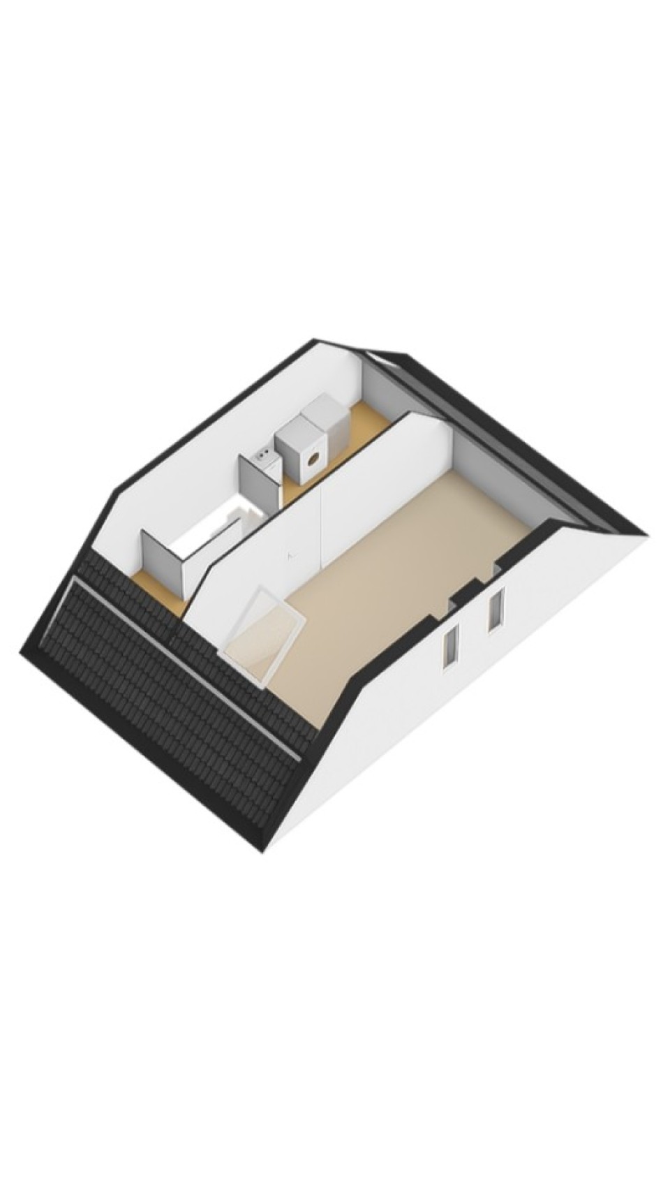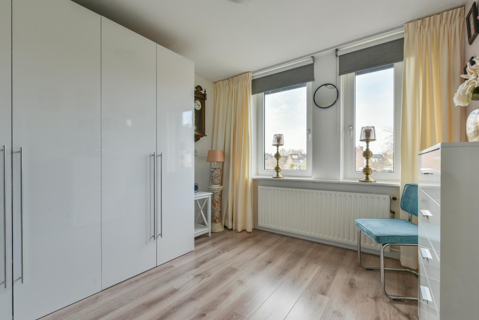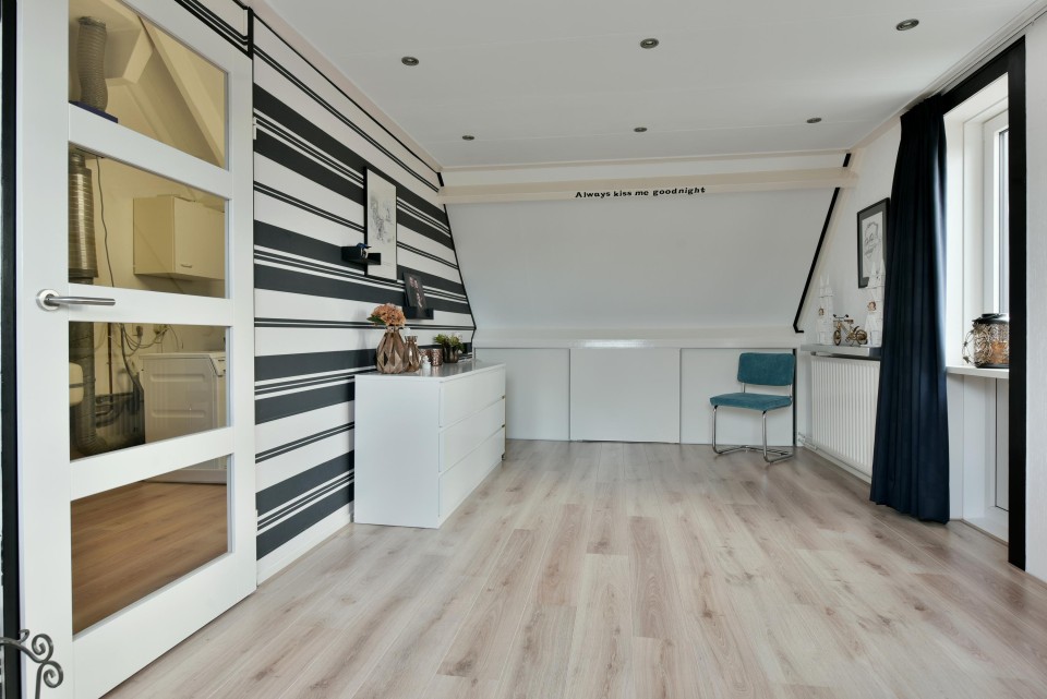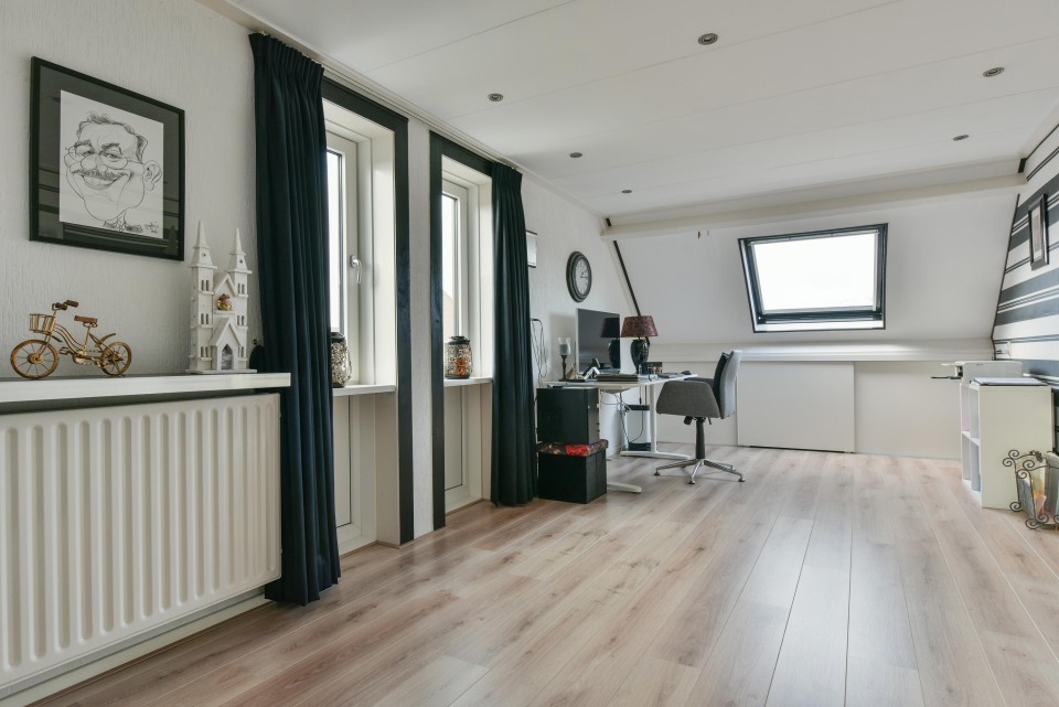Via een glazen deur naar de mooie grote en lichte 4e slaapkamer met 2 zijramen en Velux dakraam. Extra berging achter de knieschotten.