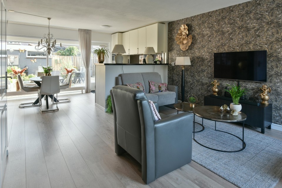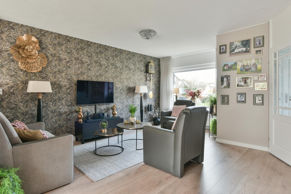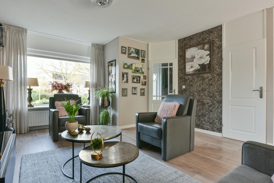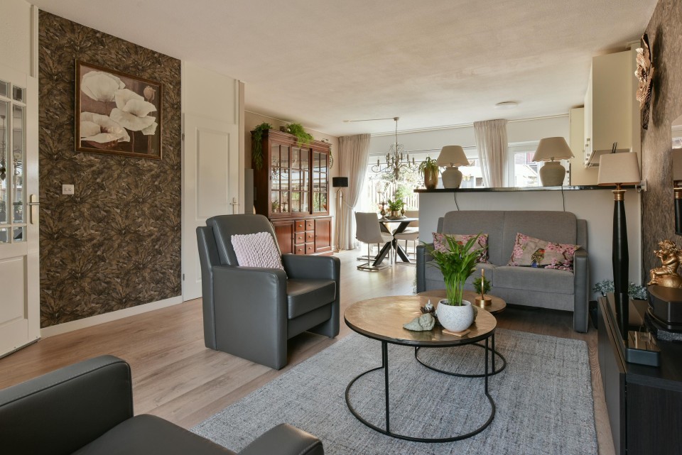 De woonkamer is ruim bemeten en heeft een mooi vrij uitzicht en aan de achterzijde een glazen pui met uitzicht over de achtertuin.