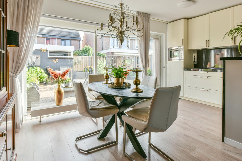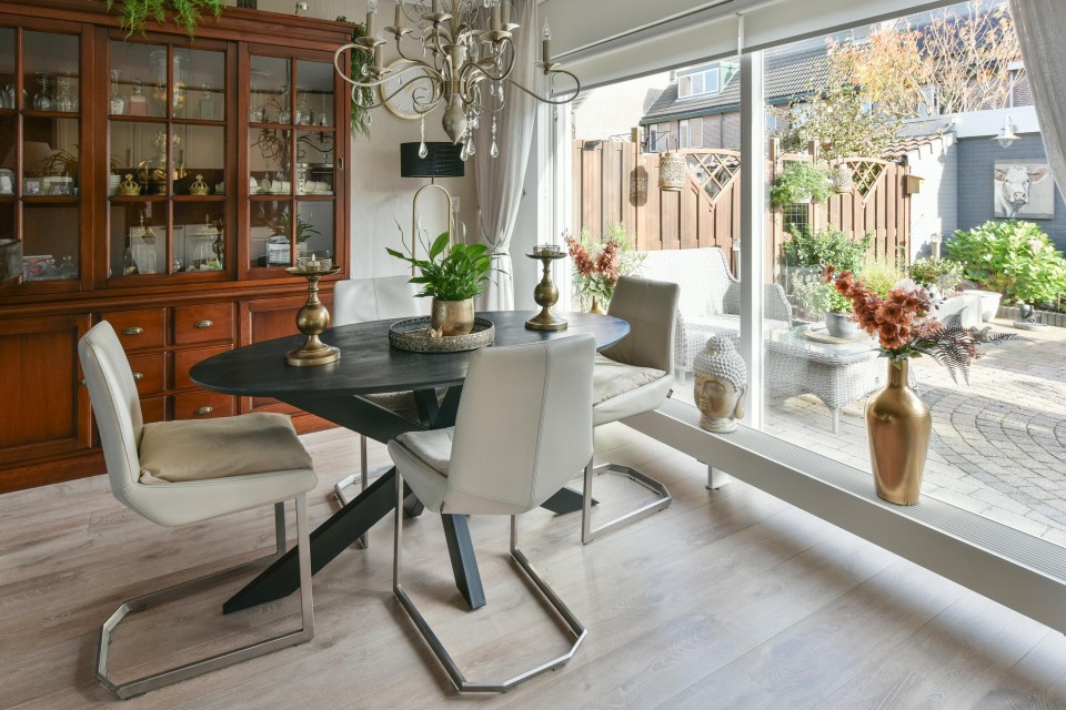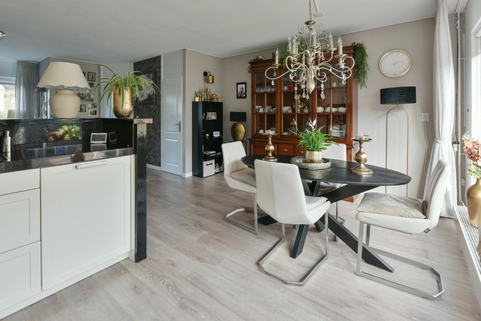 De open keuken biedt direct toegang tot de royale achtertuin op het oosten, een ideale plek om te ontspannen, te spelen of gezellig samen buiten te zijn.