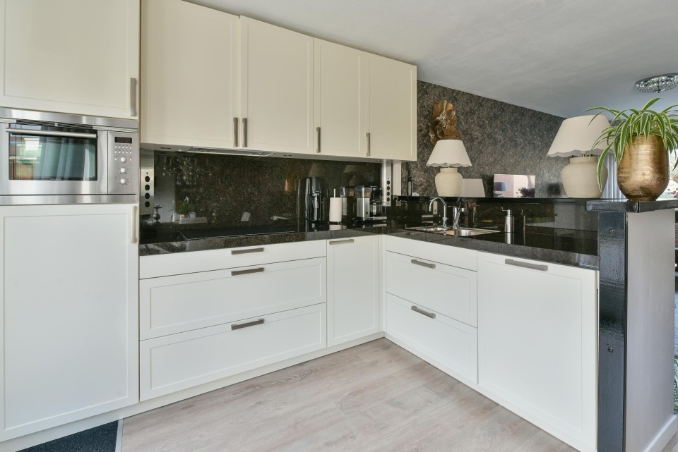 De open hoek-inbouwkeuken uit 2012 is voorzien van granieten aanrechtblad en inbouwapparatuur: inductie kookplaat (2024), afzuigkap, vaatwasser (2024), koelkast, magnetron en een quooker.