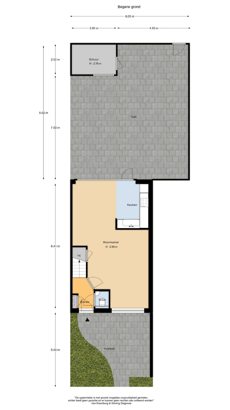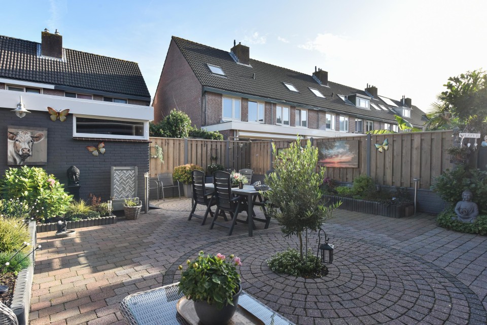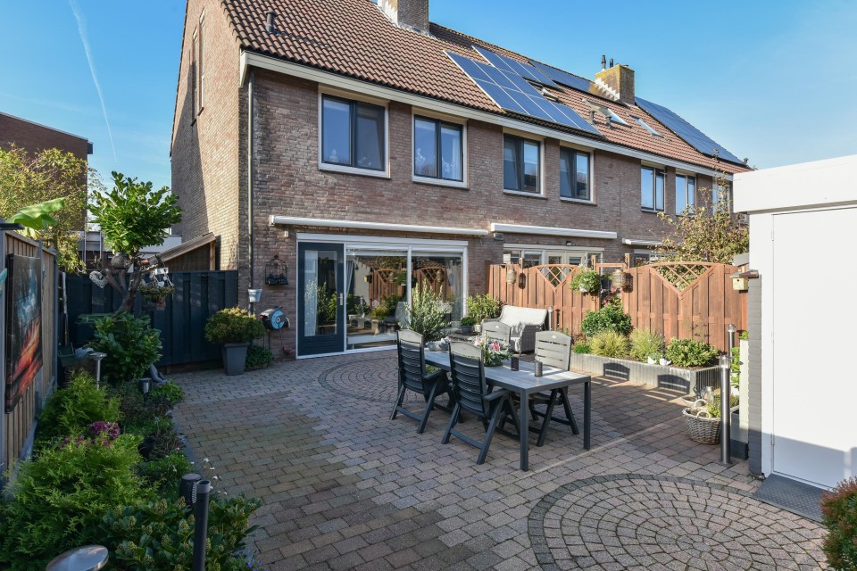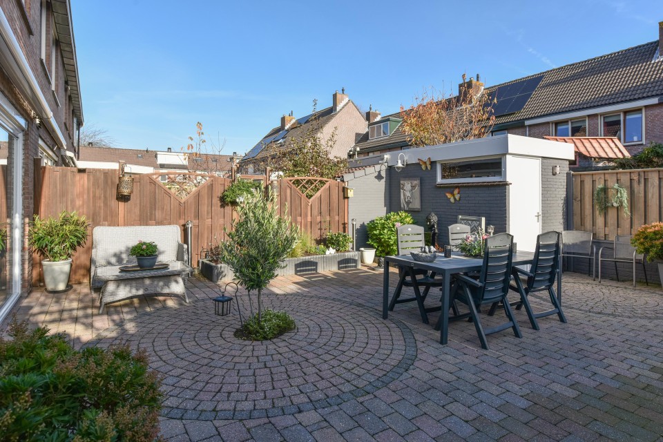 De tuin is bereikbaar via een achterom en beschikt over een praktische stenen berging met elektriciteitsaansluiting.