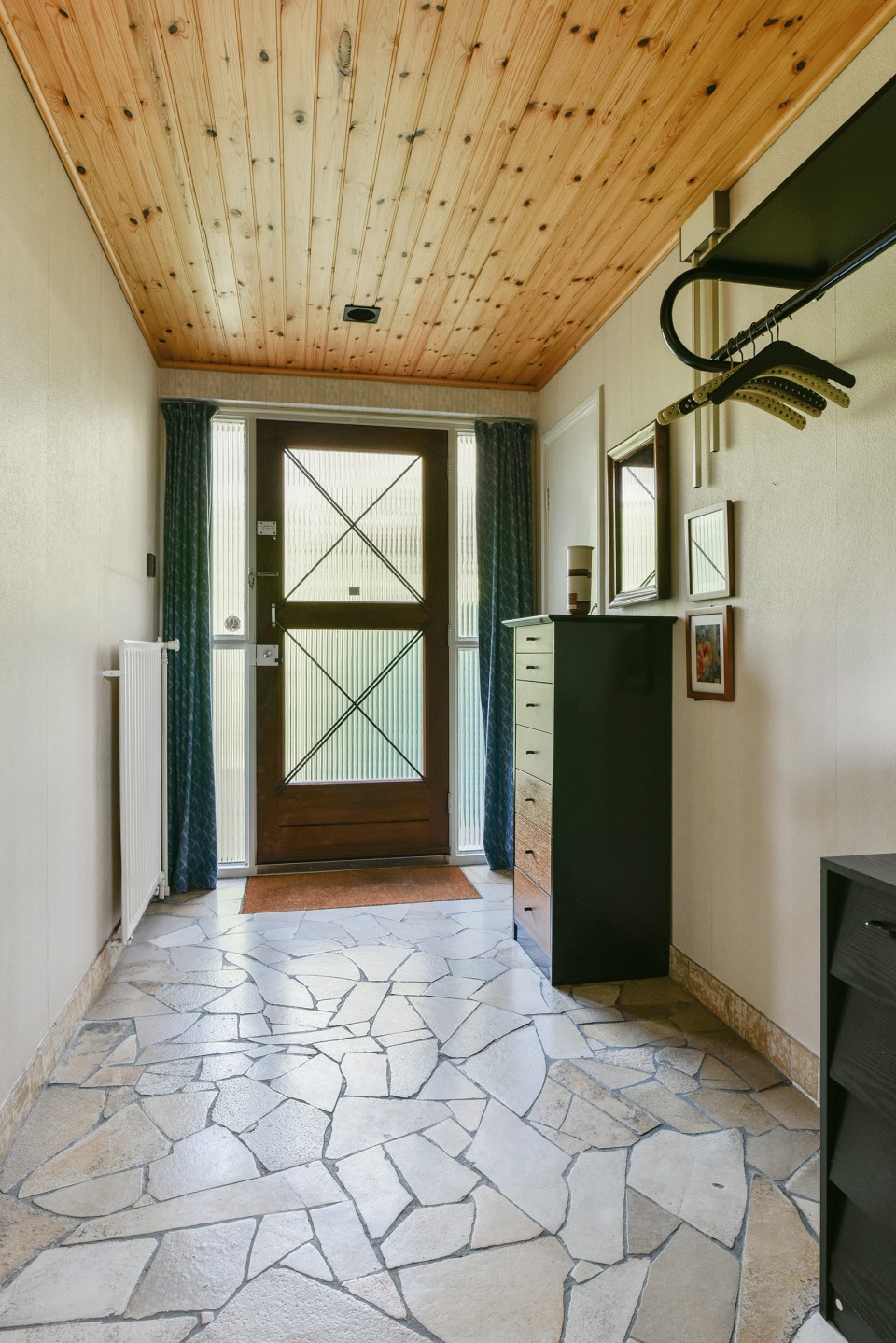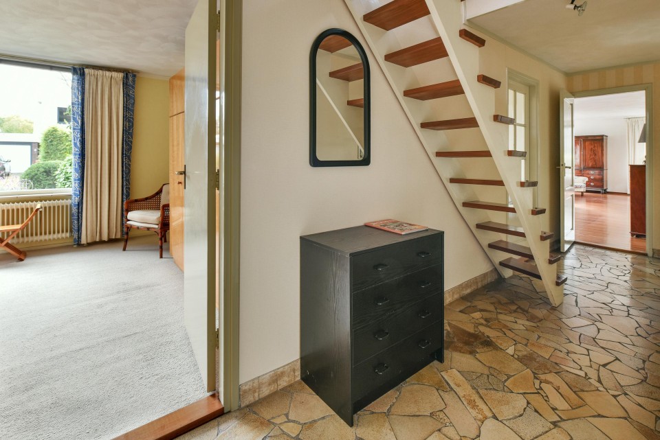 Entree-hal met leisteenvloer, meterkast met 6 groepen en aardlekschakelaar.