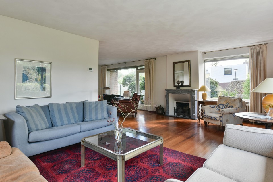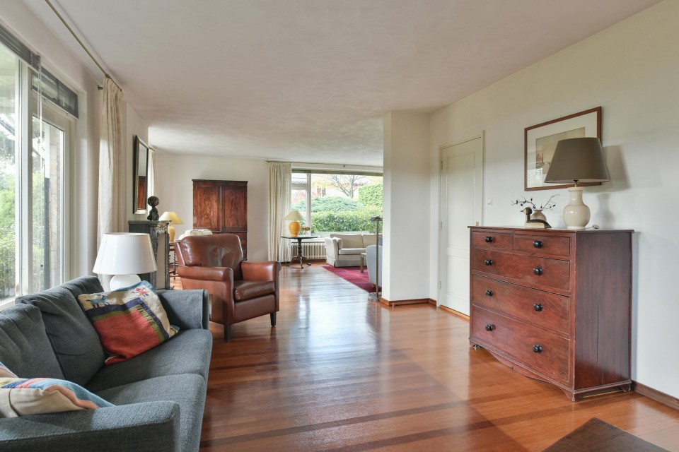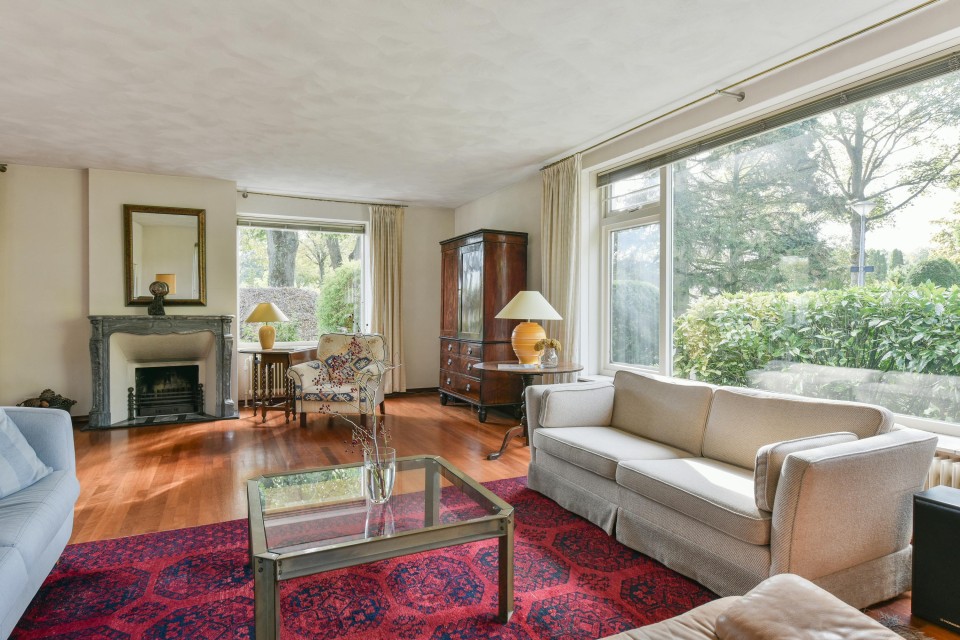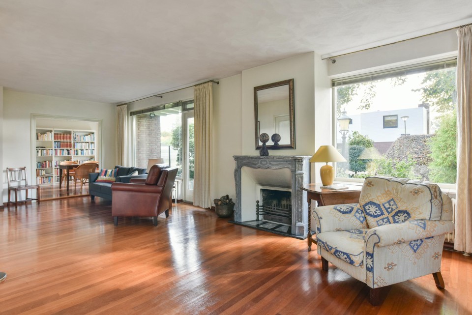 De grote en lichte L-woonkamer is voorzien van een eiken parketvloer en openhaard. Een tuindeur geeft toegang naar het terras.