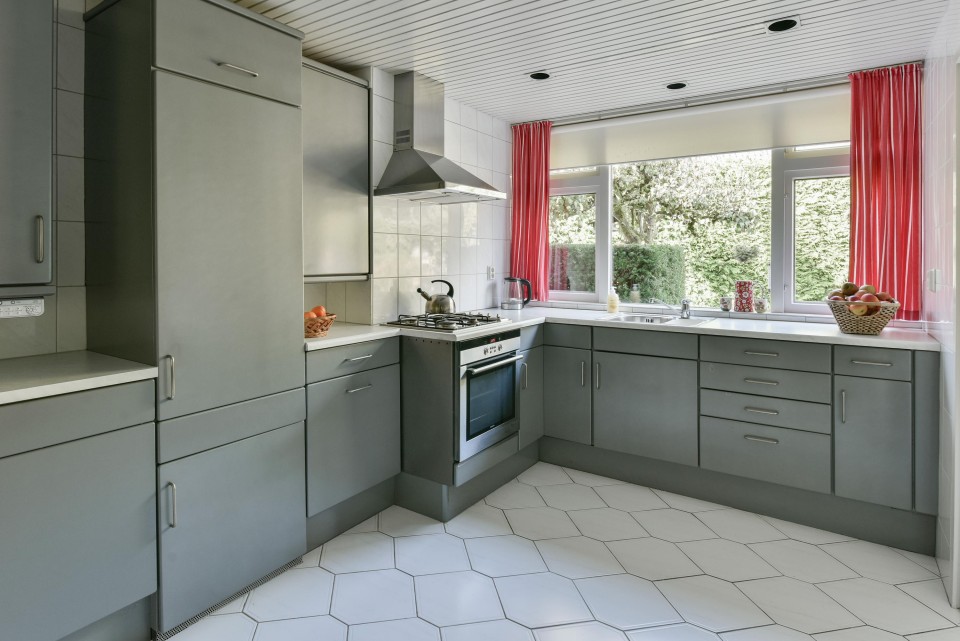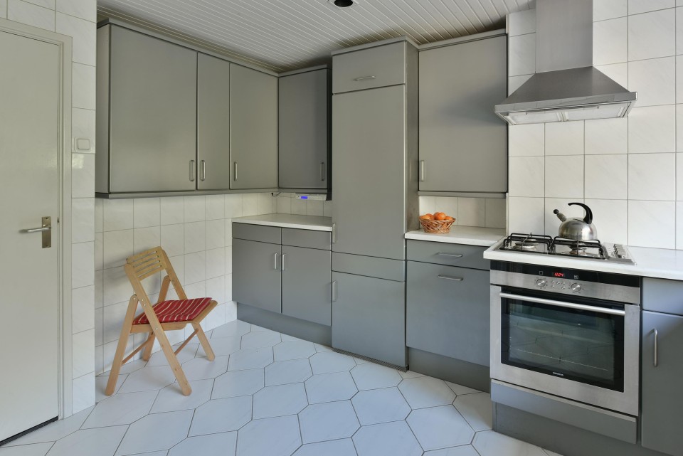 De dichte hoek-inbouwkeuken (afmetingen 3,50 m X 2,86 m = 13 m2) is voorzien van een gasfornuis, koel-/vrieskast en voldoende kastruimten, witte wandtegels en een lichte tegelvloer. Ook hier is een mooi vrij uitzicht over de achtertuin.