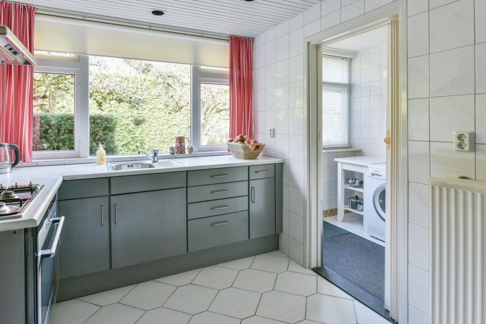 Vanuit de keuken is er toegang tot de bijkeuken voorzien van witte betegeling en idem vloertegels. Een buitendeur naar de achtertuin.