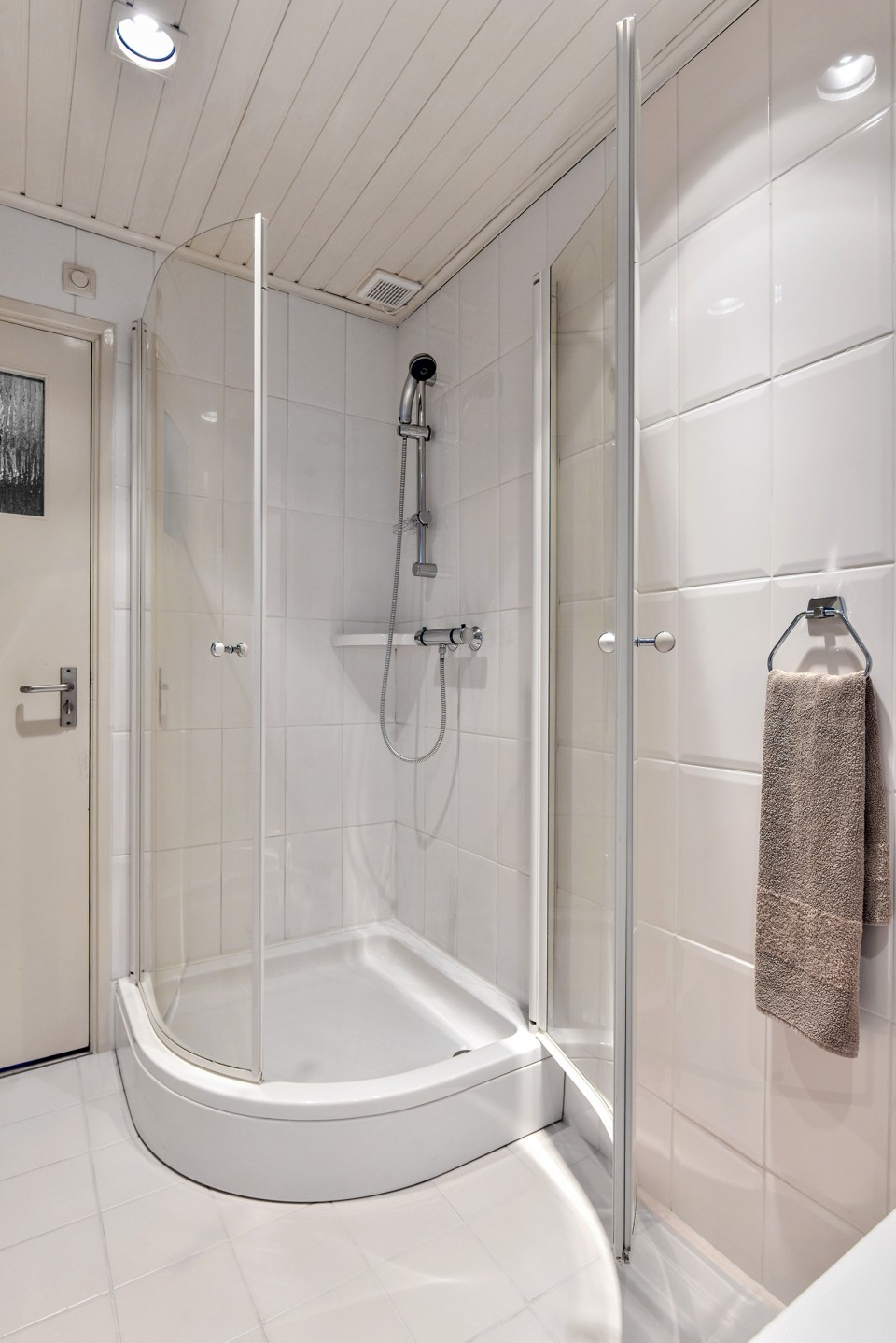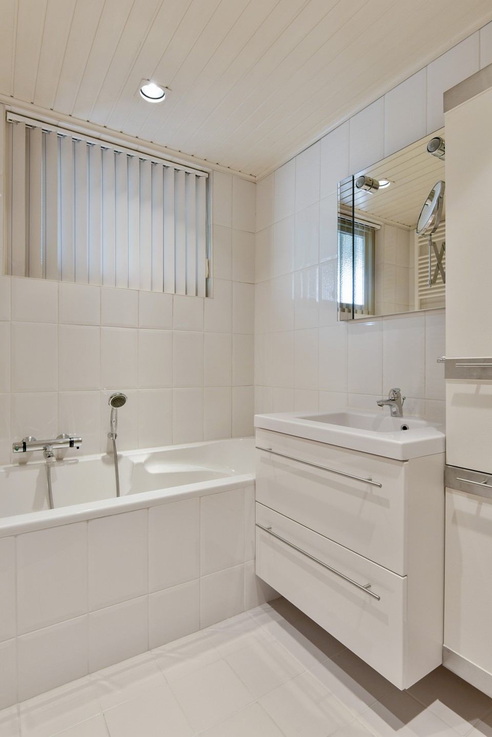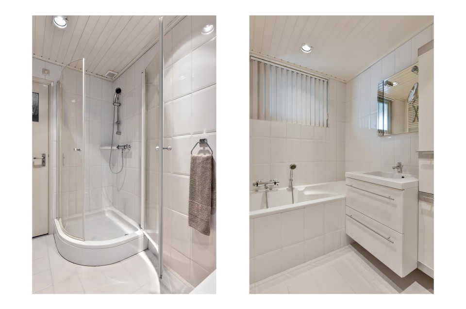 De ruime badkamer is voorzien van een ligbad, een douchecabine een wastafelmeubel en grote witte wandtegels.