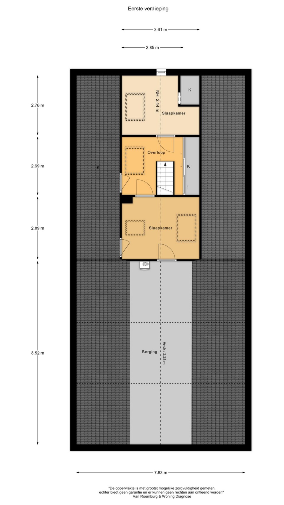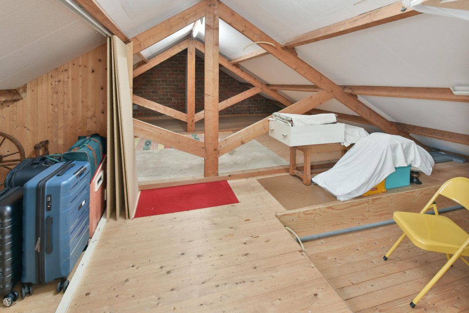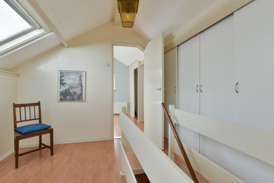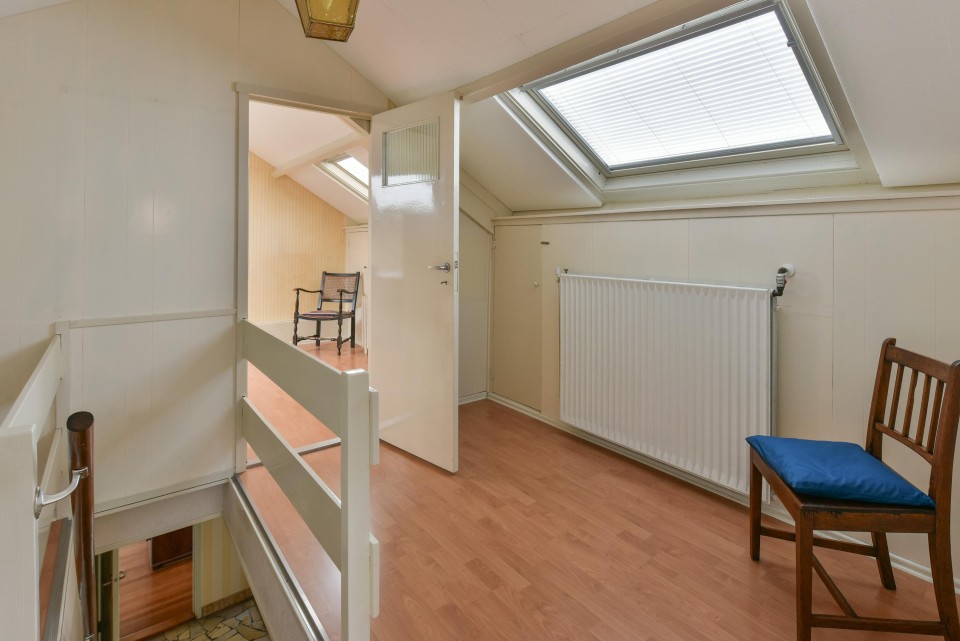 bereikbaar via de vaste trap in de binnenhal naar de ruime overloop met een vaste kastenwand en een Velux-dakraam. De gehele verdieping is voorzien van lichte laminaatvloer.