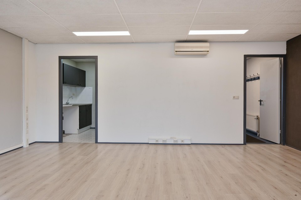 entree-hal, royale kantoor-/werkruimte met kitchenette voorzien van een airco-unit.