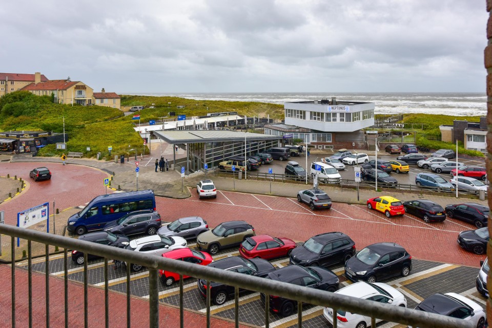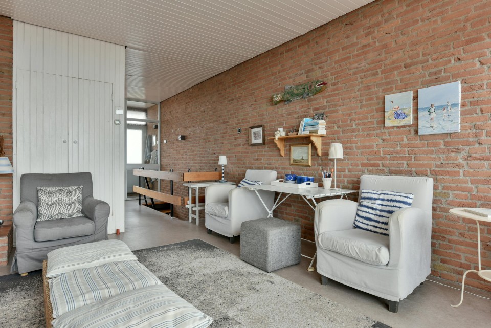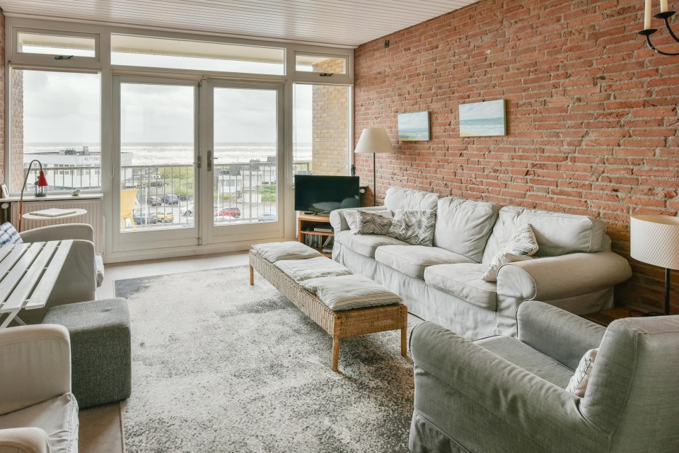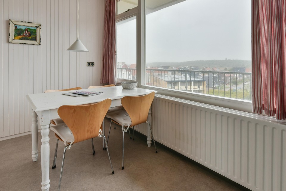 De woonkamer is aan de voorzijde gelegen en beschikt over openslaande balkondeuren naar een ruim balkon op het westen, vanwaar u een geweldig, uniek en vrij uitzicht heeft over de Noordzee. Hier kunt u de hele dag genieten van het prachtige uitzicht.